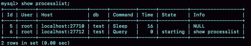 连接完成后,如果你没有后续的动作,这个连接就处于空闲状态,你可以在show processlist命令中看到它。文本中这个图是show processlist的结果,其中的Command列显示为“Sleep”的这一行,就表示现在系统里面有一个空闲连接。