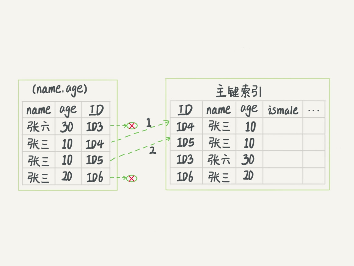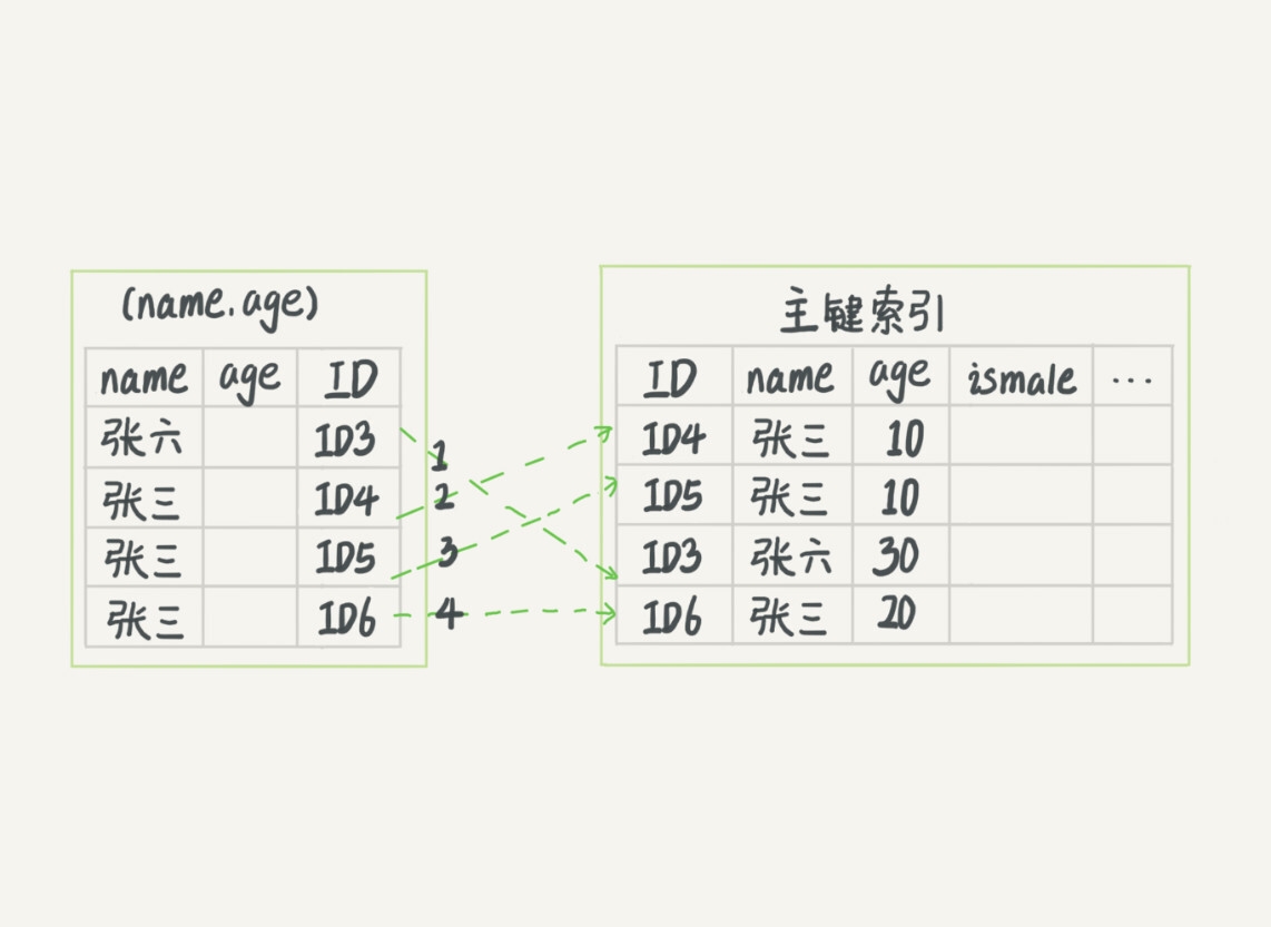 当你的逻辑需求是查到所有名字是“张三”的人时,可以快速定位到ID4,然后向后遍历得到所有需要的结果。