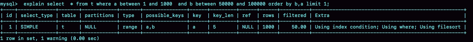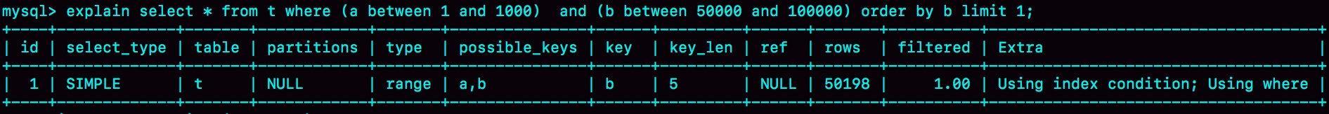 mysql> explain select * from t where (a between 1 and 1000) and (b between 50000 and 100000) order by b limit 1;