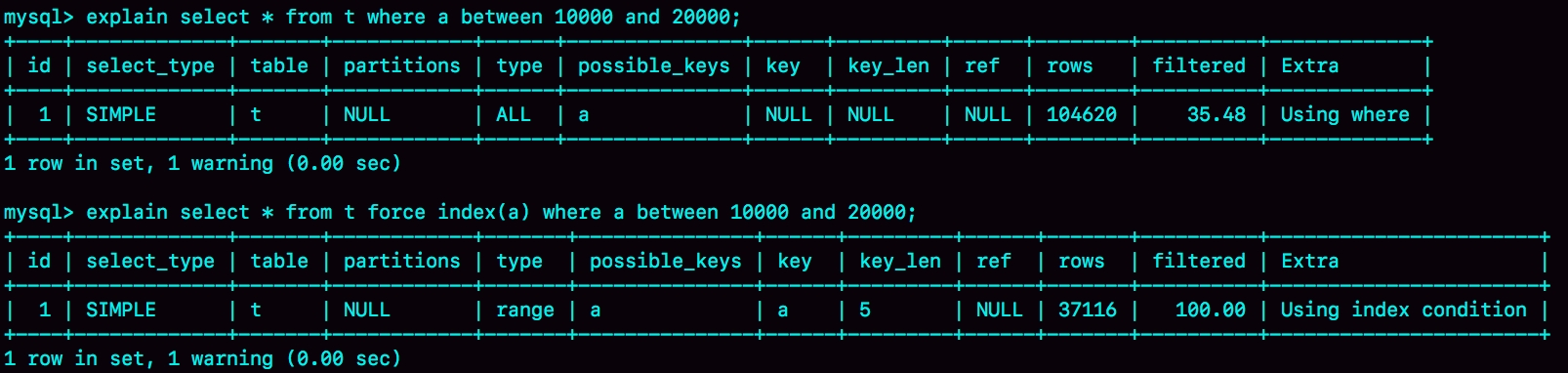 mysql> select * from t where a between 10000 and 20000;你一定会说,这个语句还用分析吗,很简单呀,a上有索引,肯定是要使用索引a的。