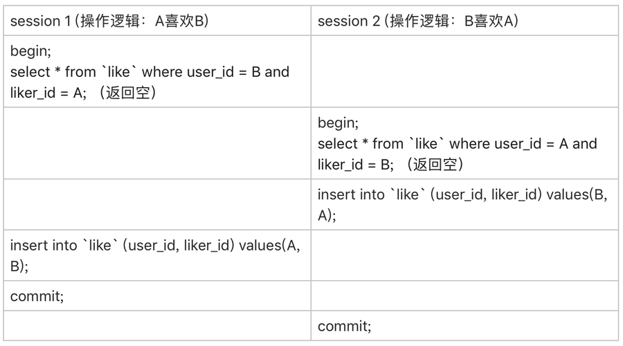 这个设计里,让“like”表里的数据保证user_id < liker_id,这样不论是A关注B,还是B关注A,在操作“like”表的时候,如果反向的关系已经存在,就会出现行锁冲突。
