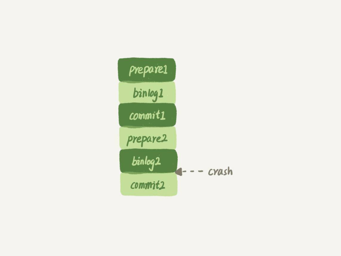 如果在图中标的位置,也就是binlog2写完了,但是整个事务还没有commit的时候,MySQL发生了crash。