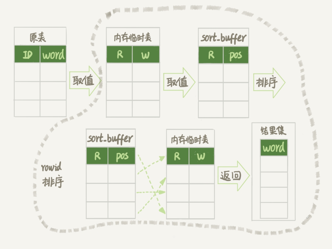 我强调了“InnoDB表”,你肯定想到了,对于内存表,回表过程只是简单地根据数据行的位置,直接访问内存得到数据,根本不会导致多访问磁盘。优化器没有了这一层顾虑,那么它会优先考虑的,就是用于排序的行越少越好了,所以,MySQL这时就会选择rowid排序。