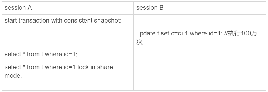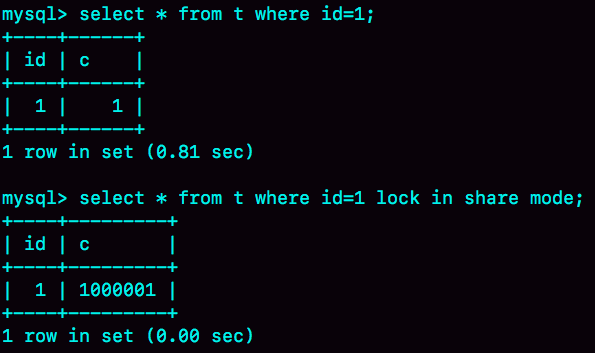 带lock in share mode的SQL语句,是当前读,因此会直接读到1000001这个结果,所以速度很快;而select * from t where id=1这个语句,是一致性读,因此需要从1000001开始,依次执行undo log,执行了100万次以后,才将1这个结果返回。