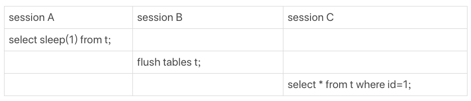 在session A中,我故意每行都调用一次sleep(1),这样这个语句默认要执行10万秒,在这期间表t一直是被session A“打开”着。然后,session B的flush tables t命令再要去关闭表t,就需要等session A的查询结束。这样,session C要再次查询的话,就会被flush 命令堵住了。