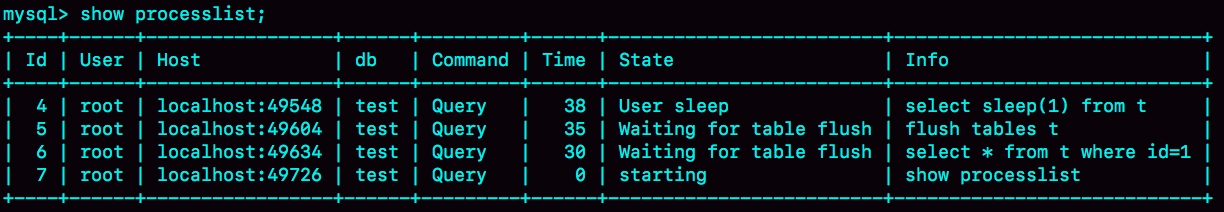 这个状态表示的是,现在有一个线程正要对表t做flush操作。MySQL里面对表做flush操作的用法,一般有以下两个: