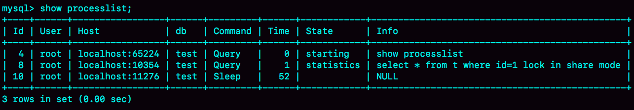 图7是这个复现步骤的show processlist结果。这个例子的排查也很简单,你看到这个show processlist的结果,肯定就知道应该怎么做了。