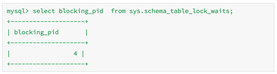 通过查询sys.schema_table_lock_waits这张表,我们就可以直接找出造成阻塞的process id,把这个连接用kill 命令断开即可。