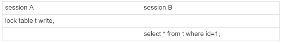 session A 通过lock table命令持有表t的MDL写锁,而session B的查询需要获取MDL读锁。所以,session B进入等待状态。