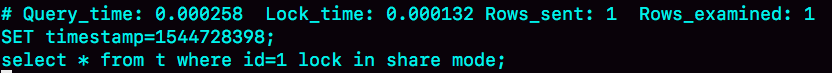 如果我把这个slow log的截图再往下拉一点,你可以看到下一个语句,select * from t where id=1 lock in share mode,执行时扫描行数也是1行,执行时间是0.2毫秒。