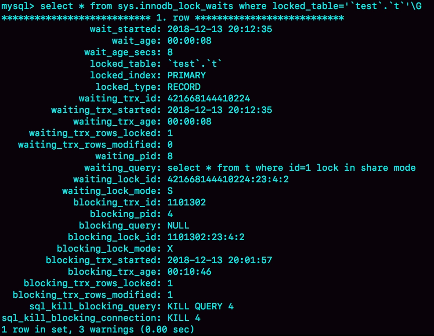 mysql> select * from t sys.innodb_lock_waits where locked_table=`'test'.'t'`\G