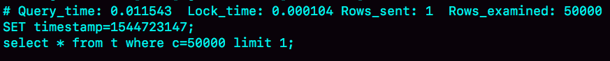 Rows_examined显示扫描了50000行。你可能会说,不是很慢呀,11.5毫秒就返回了,我们线上一般都配置超过1秒才算慢查询。但你要记住:坏查询不一定是慢查询。我们这个例子里面只有10万行记录,数据量大起来的话,执行时间就线性涨上去了。