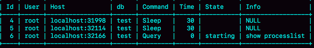 但是,怎么判断哪些是事务外空闲的呢?session C在T时刻之后的30秒执行show processlist,看到的结果是这样的。