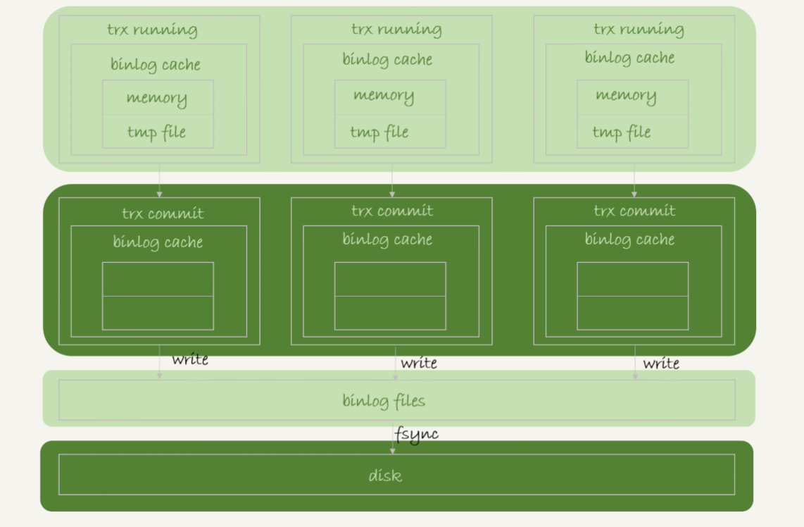 可以看到,每个线程有自己binlog cache,但是共用同一份binlog文件。
