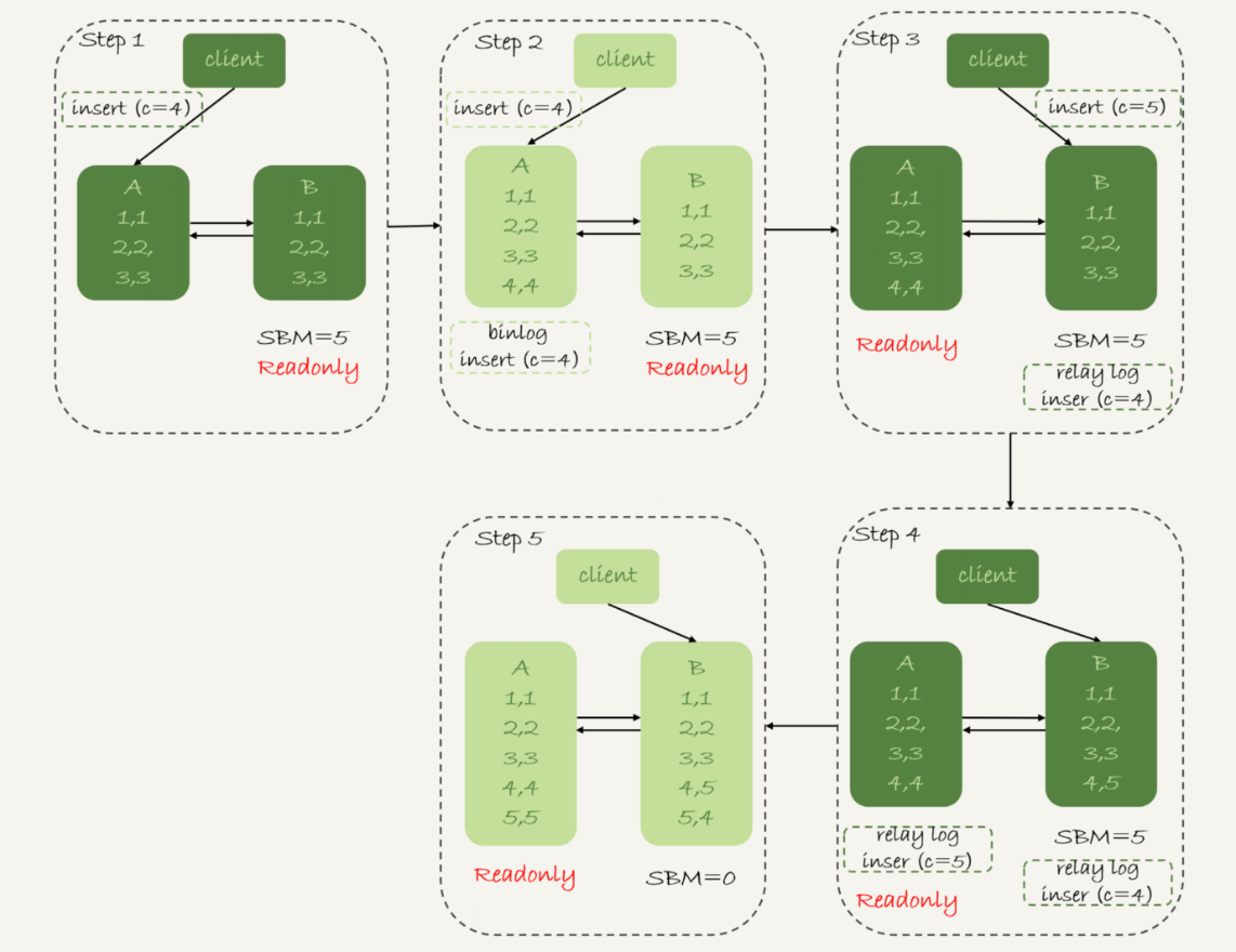 步骤5中,备库B执行“插入c=4”这个中转日志,插入了一行数据(5,4)。而直接在备库B执行的“插入c=5”这个语句,传到主库A,就插入了一行新数据(5,5)。