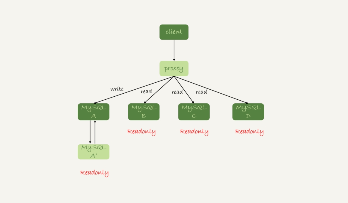 还有一种架构是,在MySQL和客户端之间有一个中间代理层proxy,客户端只连接proxy, 由proxy根据请求类型和上下文决定请求的分发路由。