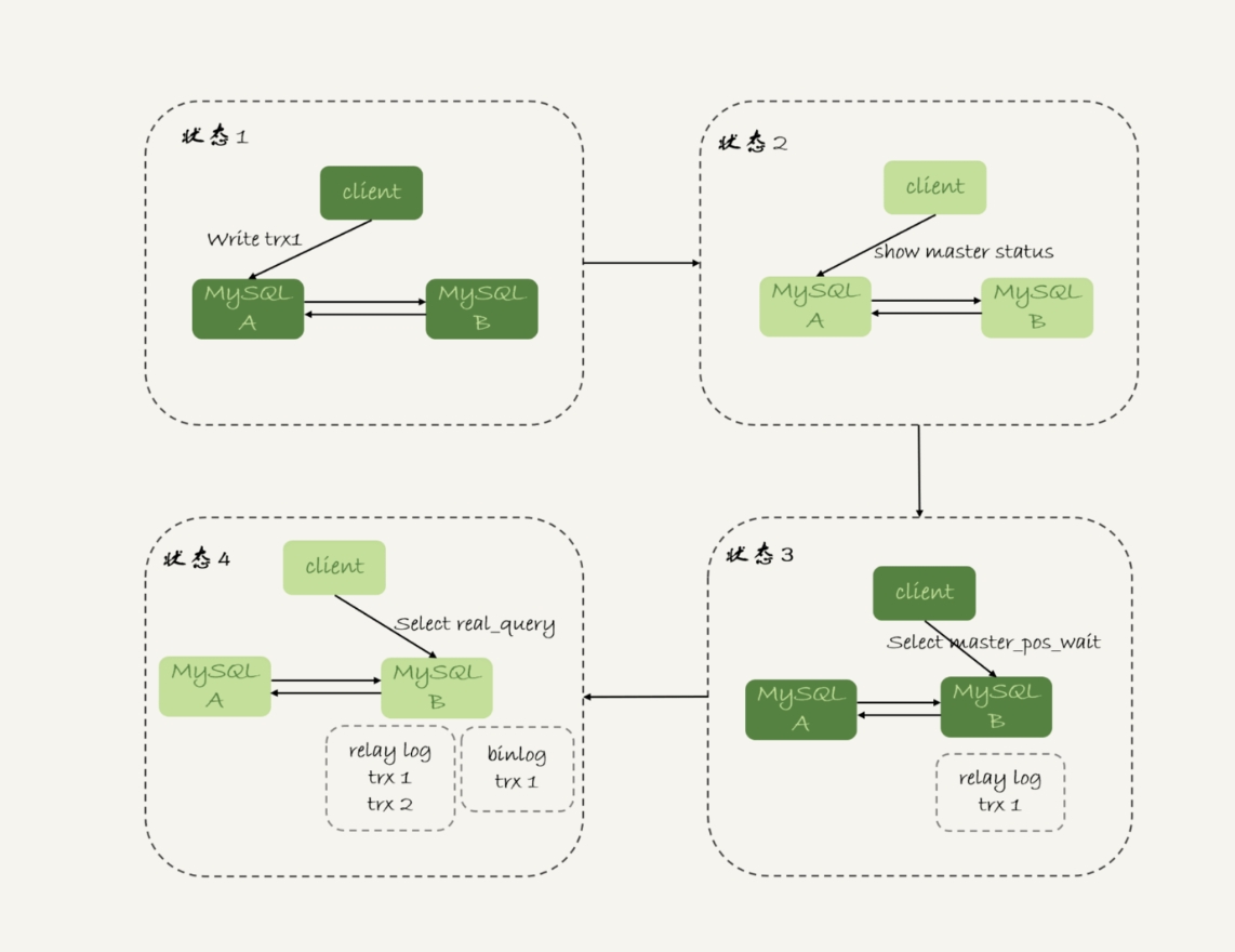 备库B一直到状态4都和主库A存在延迟,如果用上面必须等到无延迟才能查询的方案,select语句直到状态4都不能被执行。