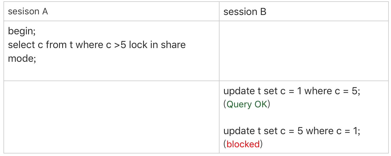 也就是说,这两条语句要加锁相同的资源,但是加锁顺序相反。当这两条语句并发执行的时候,就可能出现死锁。