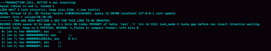 hex 0000000a和hex 00000014表示这个事务持有c=10和c=20这两个记录锁;