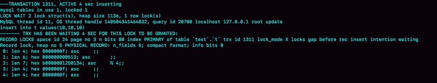 0: len 4; hex 0000000f; asc ;;第一列是主键id字段,十六进制f就是id=15。所以,这时我们就知道了,这个间隙就是id=15之前的,因为id=10已经不存在了,它表示的就是(5,15)。