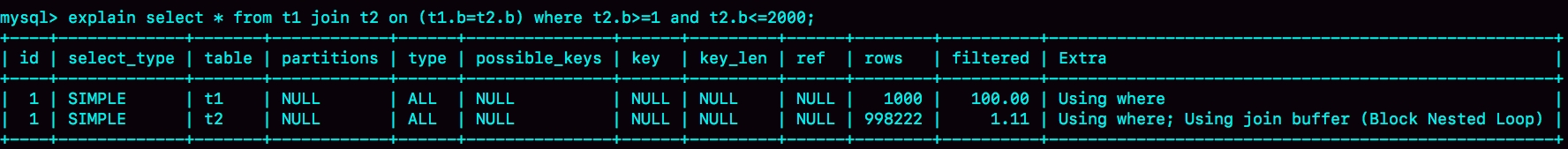 如果满足t1.b=t2.b, 再判断其他条件,也就是是否满足t2.b处于[1,2000]的条件,如果是,就作为结果集的一部分返回,否则跳过。