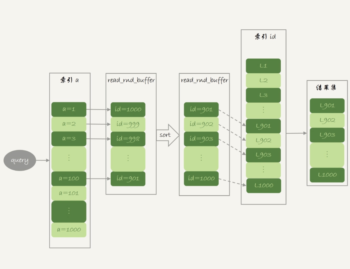 这里,read_rnd_buffer的大小是由read_rnd_buffer_size参数控制的。如果步骤1中,read_rnd_buffer放满了,就会先执行完步骤2和3,然后清空read_rnd_buffer。之后继续找索引a的下个记录,并继续循环。