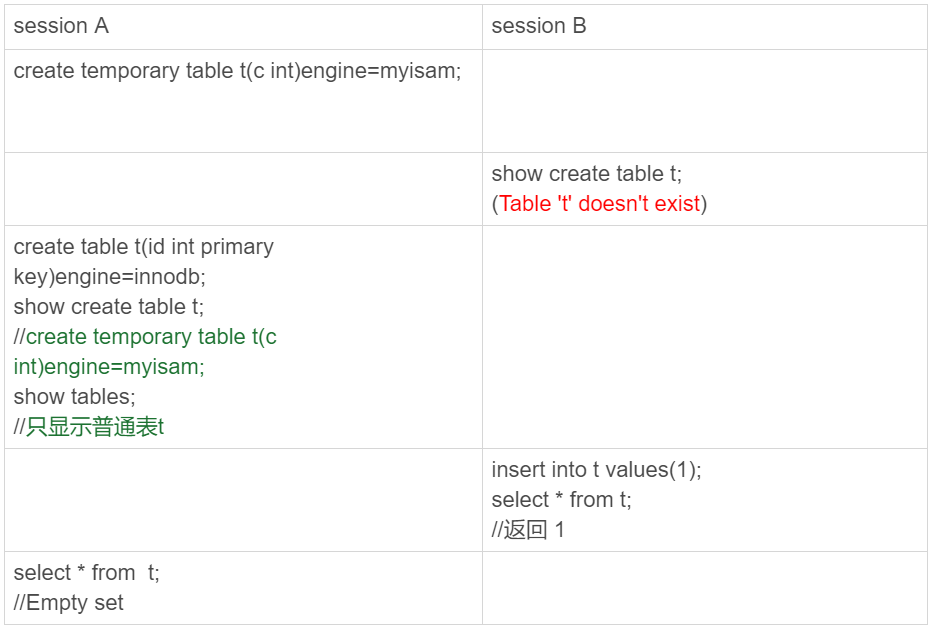 一个临时表只能被创建它的session访问,对其他线程不可见。所以,图中session A创建的临时表t,对于session B就是不可见的。