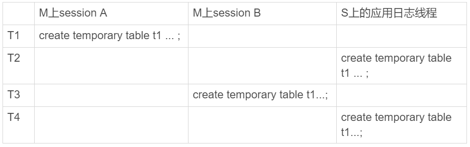 主库M上的两个session创建了同名的临时表t1,这两个create temporary table t1 语句都会被传到备库S上。