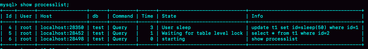 在这个执行序列里,session A的update语句要执行50秒,在这个语句执行期间session B的查询会进入锁等待状态。session C的show processlist 结果输出如下: