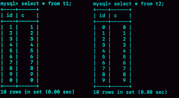 然后,我分别执行select * from t1和select * from t2。