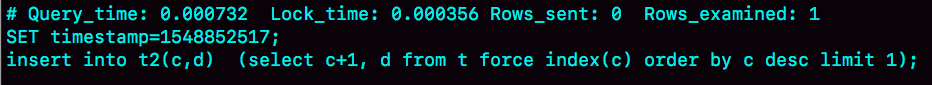 通过这个慢查询日志,我们看到Rows_examined=1,正好验证了执行这条语句的扫描行数为1。