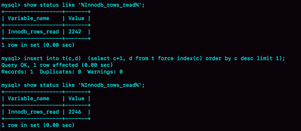 从另一个角度考虑的话,我们可以看看InnoDB扫描了多少行。如图5所示,是在执行这个语句前后查看Innodb_rows_read的结果。