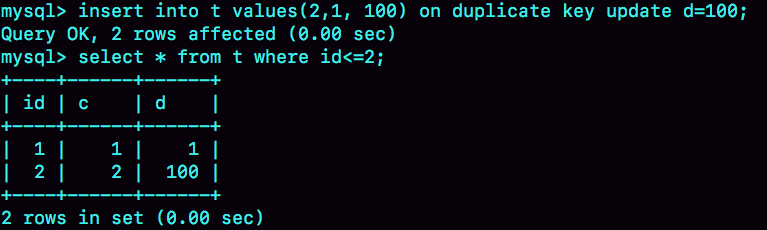 需要注意的是,执行这条语句的affected rows返回的是2,很容易造成误解。实际上,真正更新的只有一行,只是在代码实现上,insert和update都认为自己成功了,update计数加了1, insert计数也加了1。