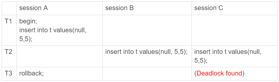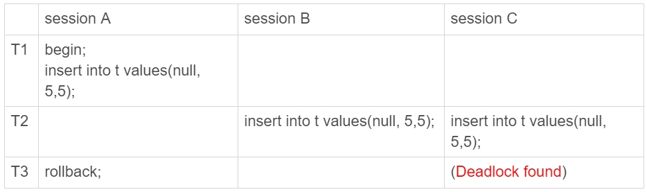 T3时刻,session A回滚。这时候,session B和session C都试图继续执行插入操作,都要加上写锁。两个session都要等待对方的行锁,所以就出现了死锁。