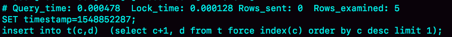 由于语义里面有limit 1,所以只取了临时表的第一行,再插入到表t中。这时,Rows_examined的值加1,变成了5。