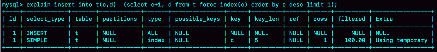 它的执行流程也比较简单,从表t中按照索引c倒序,扫描第一行,拿到结果写入到表t2中。