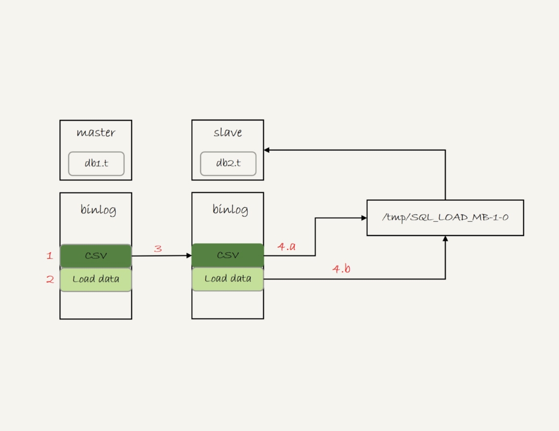 往binlog文件中写入语句load data local infile ‘/tmp/SQL_LOAD_MB-1-0’ INTO TABLE `db2`.`t`。