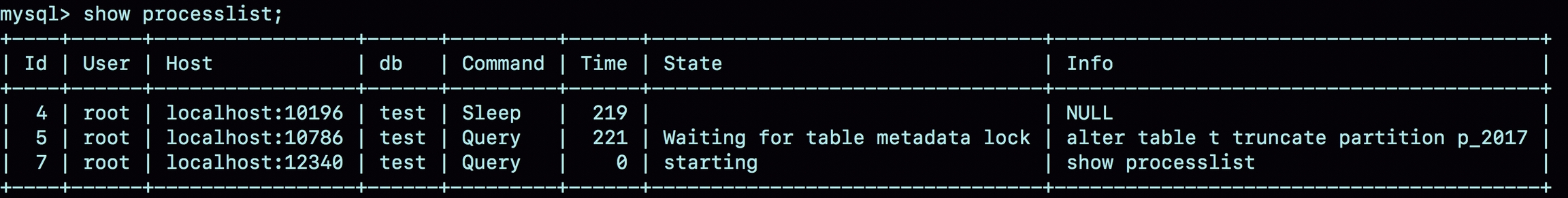 可以看到,虽然session B只需要操作p_2107这个分区,但是由于session A持有整个表t的MDL锁,就导致了session B的alter语句被堵住。