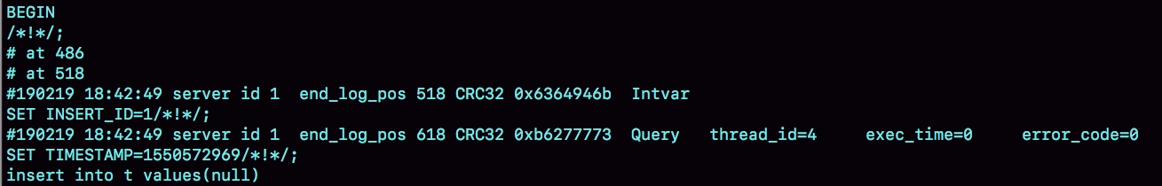 可以看到,在insert语句之前,还有一句SET INSERT_ID=1。这条命令的意思是,这个线程里下一次需要用到自增值的时候,不论当前表的自增值是多少,固定用1这个值。