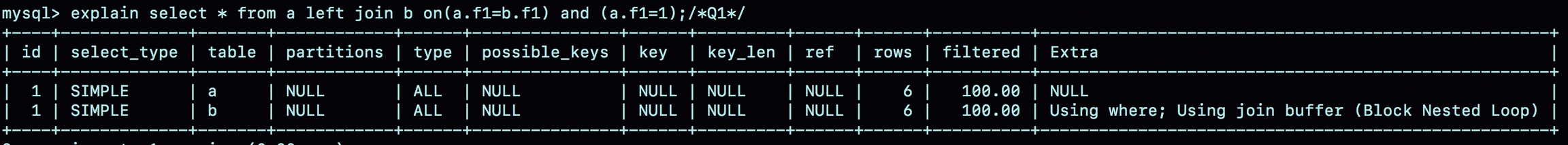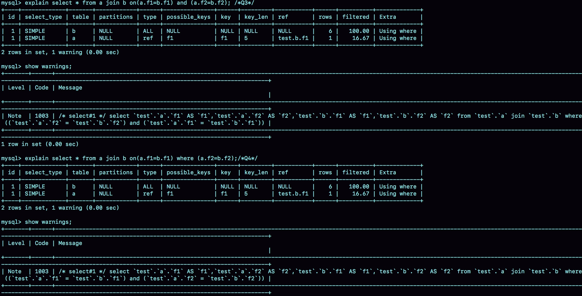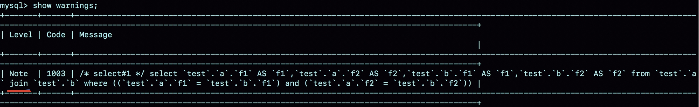 select * from a join b on(a.f1=b.f1) where (a.f2=b.f2);/*Q4*/我们再使用一次看explain 和 show warnings的方法,看看优化器是怎么做的。