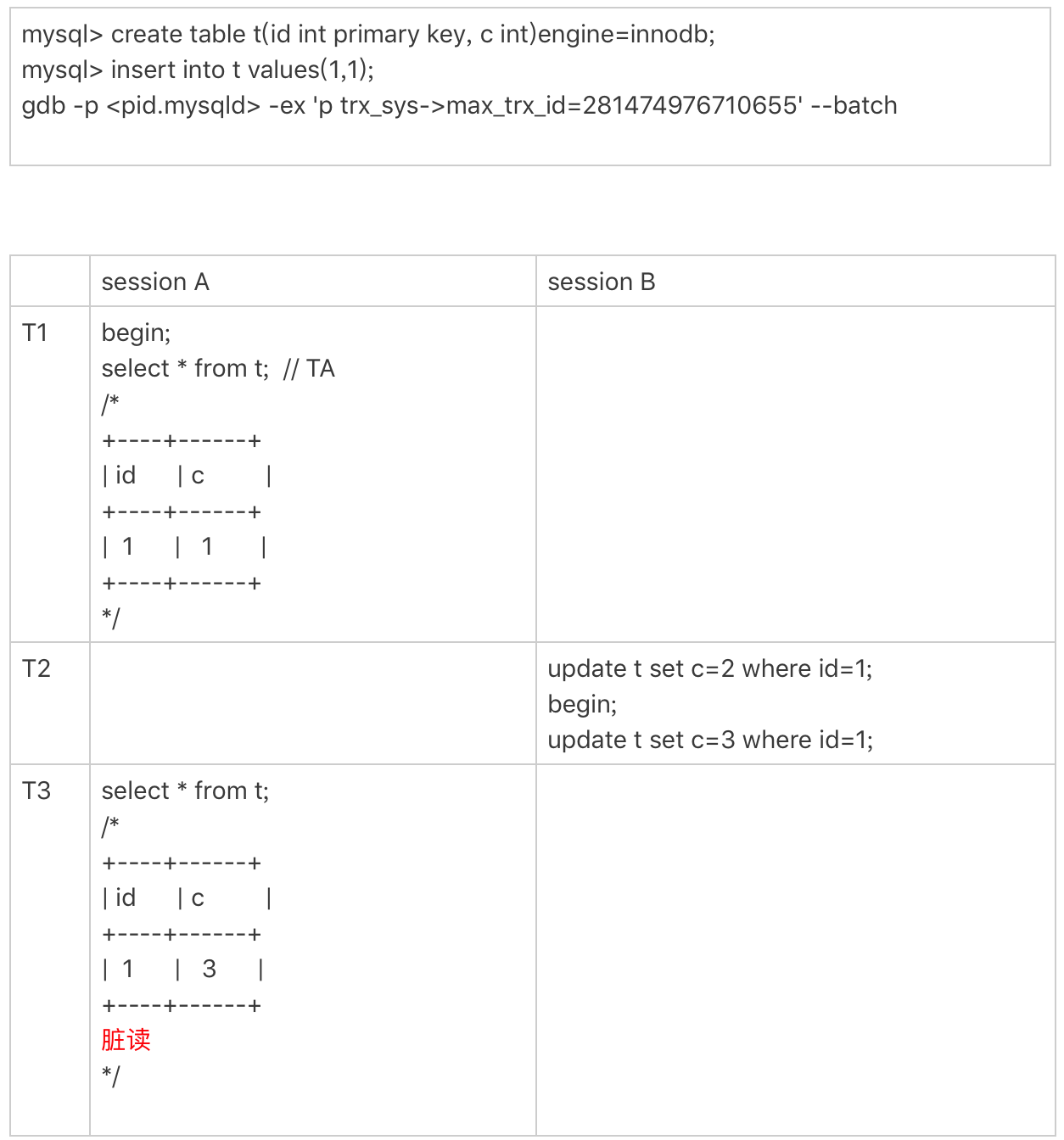 InnoDB的max_trx_id 递增值每次MySQL重启都会被保存起来,所以我们文章中提到的脏读的例子就是一个必现的bug,好在留给我们的时间还很充裕。