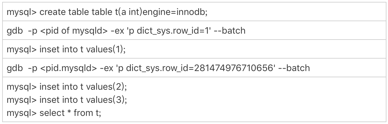 可以看到,在我用gdb将dict_sys.row_id设置为248之后,再插入的a=2的行会出现在表t的第一行,因为这个值的row_id=0。之后再插入的a=3的行,由于row_id=1,就覆盖了之前a=1的行,因为a=1这一行的row_id也是1。
